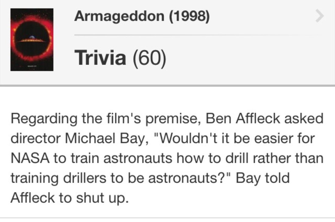 seareigns Uncategorized July 1, 2016December 6, 2018 1 Minute ethergaunts: beeishappy: Armageddon is one of the few DVDs I didn’t sell because Ben Affleck on the commentary track is relentless. Below is the clip of the commentary from where this tidbit of trivia came from. Please take a moment to witness the magic. this is so fucking funny Share this: Click to share on X (Opens in new window) X Click to share on Facebook (Opens in new window) Facebook Like Loading... Related Published by seareigns View all posts by seareigns Published July 1, 2016December 6, 2018